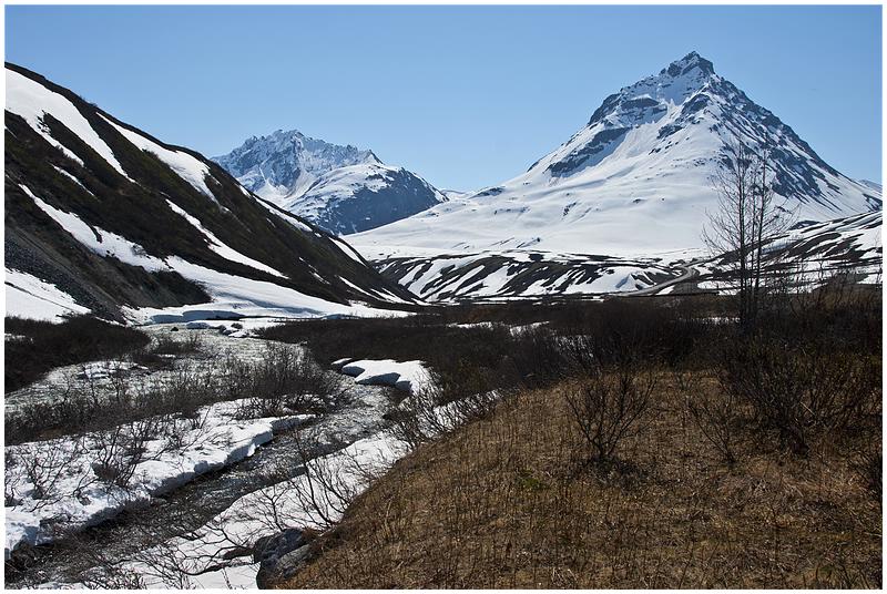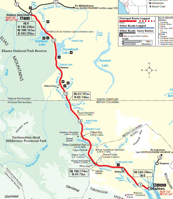 Wieder ist an der Grenzstation eine Dame im Einsatz. Hinter der Grenze bin ich wieder in Britisch Columbia und noch einigen Meilen wieder ein Bär am Strassenrand. Es geht berg an und die Baumgrenze ist erreicht. Links und rechts der Strasse liegt Schnee, als ich den Chilkat Pass mit seinen knapp 1000 Metern erreiche. Von BC geht es wieder nach Yukon hinein und gegen 13:00 Uhr bin ich in Haines Jct. Der Ort ist nicht besonderes, also nur Tanken, Wasser auffüllen und kurz ein Besuch im Visitor Center.
