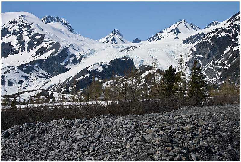 Nach dem ich mir noch etwas die Stadt angeschaut habe, fahre ich stadtauswärts zum Valdez Glacier. 1,5 Meilen vor dem Gletscher ist der Valdez Glacier CG. Hier reserviere ich mir einen Stellplatz, nicht weit von einem Wasserfall entfernt. Danach fahre ich zum Gletscher raus und laufe dort ein Stück am Wasser entlang. Wieder auf dem CG bemerke ich neben meinen Stellplatz im Baum ein Adlernest. Aus dem Nest kann man deutlich den Kopf eines Weißkopfadlers sehen. Mit dem CG Host komme ich ins Gespräch und er zeigt mir eine Stelle wo ich noch besser das Nest beobachten kann. Irgendwann kommt er noch einmal zu mir und berichtet, dass jetzt der zweite Adler am Nest sitzt. Mit Stativ und Tele mache ich auf den Weg um beide Adler abzulichten.