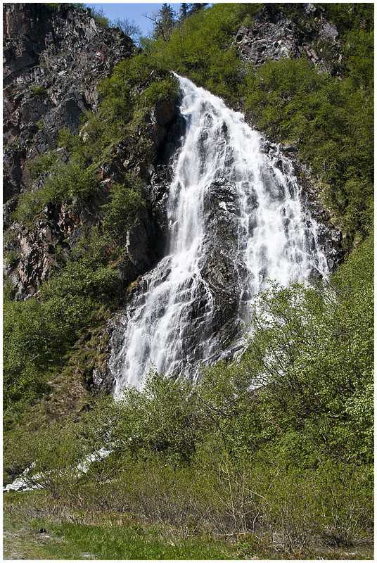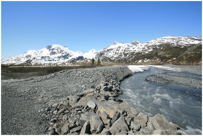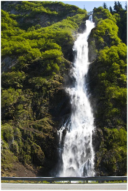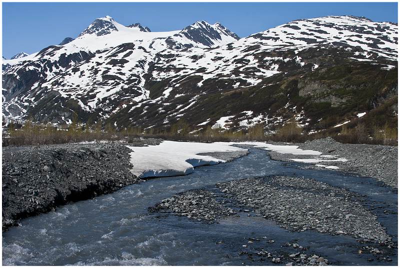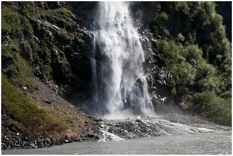 Um 10:00 starte ich, das Wetter ist klar bei 17°C. Hinter Gakona Jct wechsele ich auf den Richardson Hwy und steuere mein nächstes Ziel Valdez an. Eine etwas längere Pause lege ich am Willow Lake ein. Die Sicht ist klar und man kann in der Ferne die Wrangell Mt sehen. Zum ersten mal auf dieser Tour sehe ich auch bewusst die Trans-Alaska-Pipeline. Aus Wald wird Gebirge und ich komme in die Region der Gletscher vor Valdez. Am Worthington Glacier lege ich eine Pause ein, bevor es dann über den Thompson Pass (2678 ft.) berg ab an die Küste geht. Unterwegs gibt es noch zwei sehenswerte Wasserfälle, den Bridail Veil Falls und den Horsetail Falls.