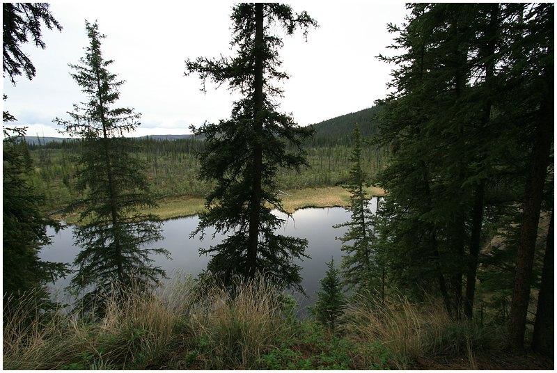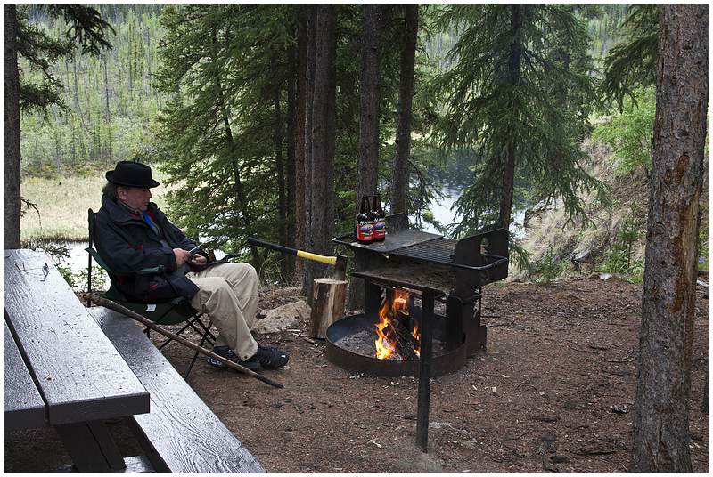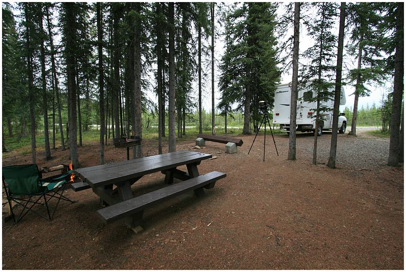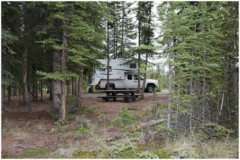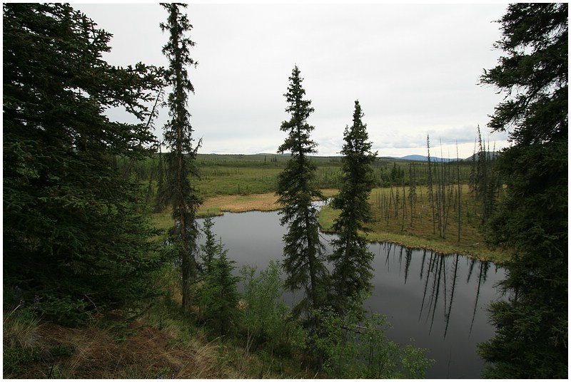 Beim Eintreffen in Delta Jct hat es wieder begonnen zu regnen. Mit Delta Jct habe ich den nördlichsten Punkt meiner Tour erreicht. Nun schwenke ich nach Südosten und über den Alaska Hwy fahre ich nach Tok. Einige Meilen vor Tok wird das Wetter besser, die Sonne kommt raus und die Temperaturen sind wieder bei 16°C. Vor Tok wird die Fahrt mehrmals durch Flagmans gestoppt, Grund dafür sind Feuerwehrbewegungen in einem Waldbrandgebiet. In Tok gehe ich noch einmal nach Fast Eddy und setze dann die Fahrt weiter fort. Hinter Tok wechsele ich auf den Taylor Hwy in Fahrtrichtung Chicken. Die ersten 30 Meilen fahre ich durch ein Gebiet, das durch Waldbrand gezeichnet ist. An einer Steigung kommt mir plötzlich ein Autorad entgegen gerollt und etwas weiter sehr ich ein Auto mit Hänger. Ich überhole und in diesem Moment fällt das nächste Rad von der Ladefläche. Durch hupen und Zeichen mache ich den Fahrer auf diese Situation aufmerksam. Der nächste CG ist der West Fork CG am Jonas Lake. Den Stellplatz den ich mir hat aussuche hat einen Blick von oben auf den kleinen Jonas Lake. Als mein Campfire brennt will ich mir ein Bier aus dem Kühlschrank holen, aber der Wagen ist abgeschlossen und der Schlüssel ist nicht zu finden. Ich suche alles ab, den Waldboden, die Fahrerkabine, die Wege die ich zu fuß zurückgelegt habe, nichts. Ich reiße das Feuer auseinander, negativ. Das kann ja lustig werden wenn Wagen(Zündschlüssel verschwunden sind. Über eine Stunde suche ich alles ab, dann durch Zufall, sehe ich dass der Schlüssel in der Klappe steckt wo die Axt verstaut ist. Große Erleichterung und dafür habe ich mir eine zusätzliches Bier spendiert.
