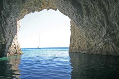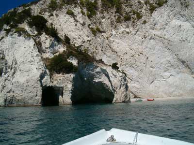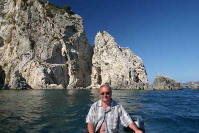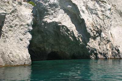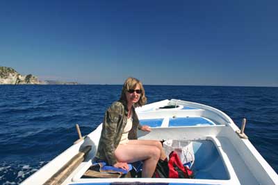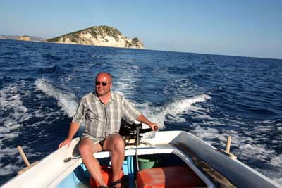 die Weiterfahrt. Wir steuerten nun die Insel Marathonissi an, die Schildkröten-Insel. Diese Insel hat die Form einer Schildkröte und dient auch Nistplatz der Caretta. An der östlichen Seite legten wir dann eine Pause ein und genossen den fast tropisch anmutenden Strand. |